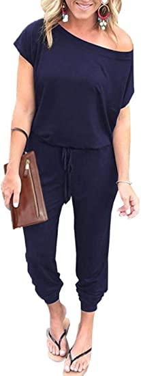Women's Loose Solid Off Shoulder Elastic Waist Stretchy Long Romper Jumpsuit with Pockets